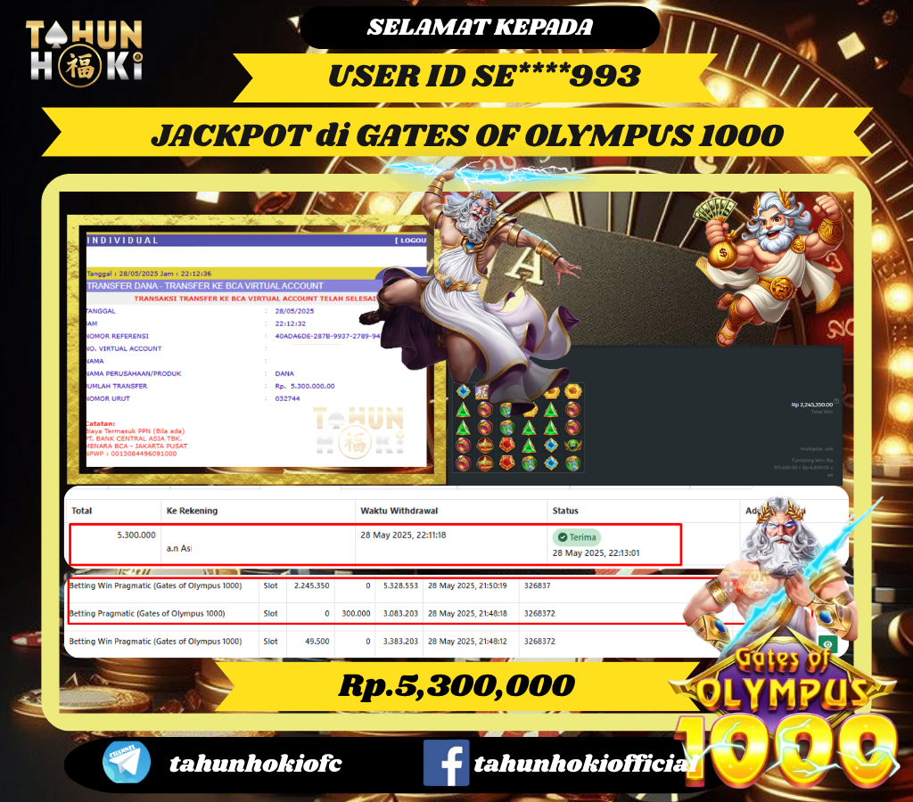 TAHUNHOKI MENANG GATES OF OLYMPUS 1000 PRAGMATIC PLAY Rp. 5,300,000,- LUNAS